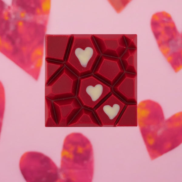 raspberry toffee bar packaging with heart designs on a pink background
