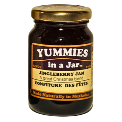 Two jars of Yummies in a Jar Jingleberry Jam with a red bow on a beige background